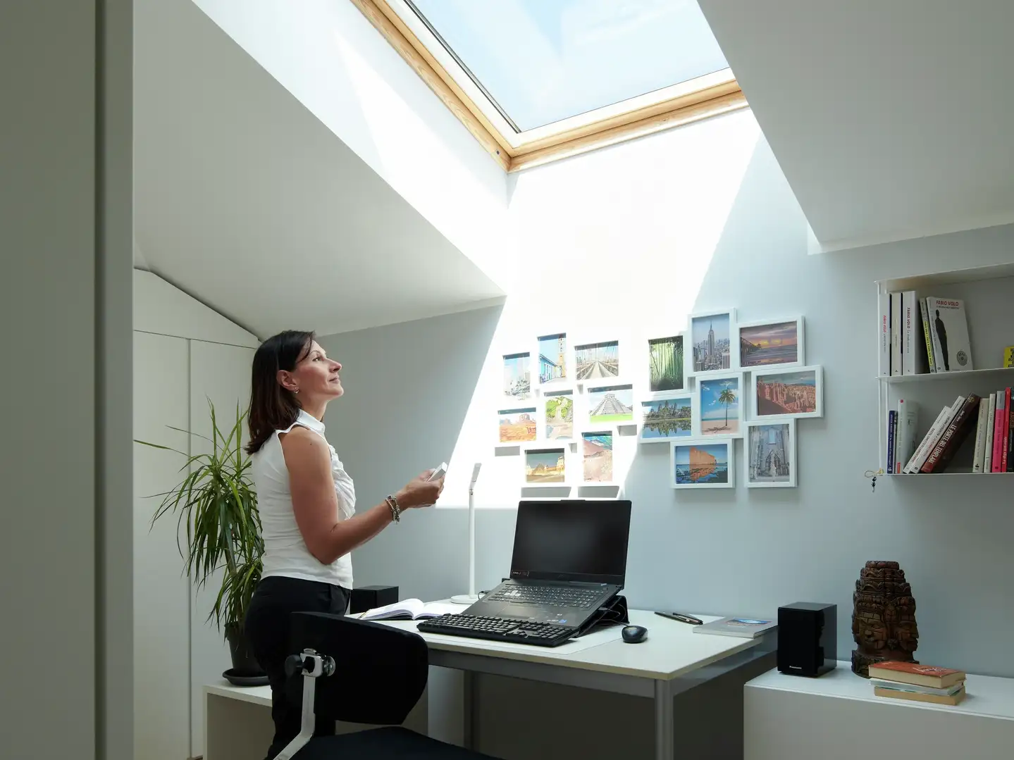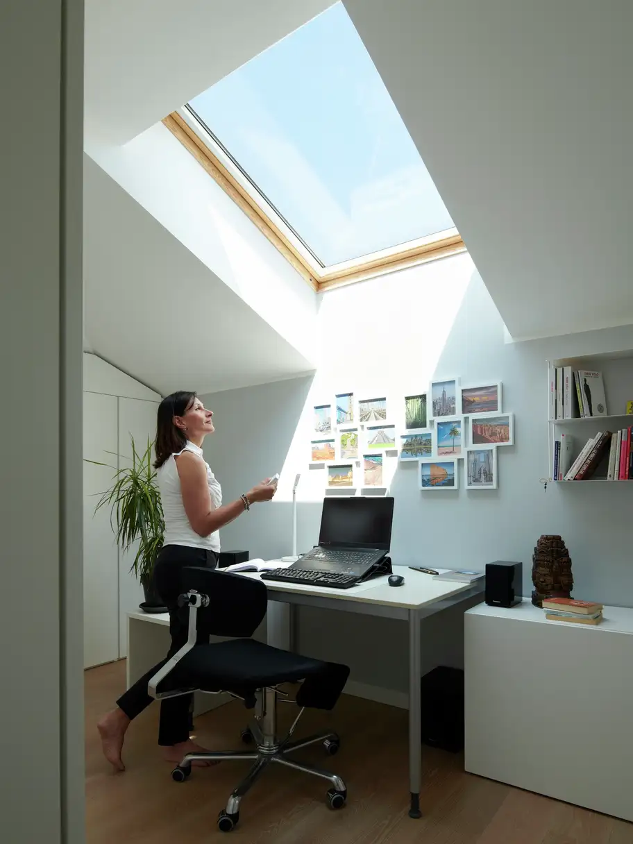 - Optez pour un bureau connecté pour disposer d’un espace de travail intelligent et fonctionnel : des systèmes comme VELUX App control ou VELUX Active permettent de réguler automatiquement la lumière et la ventilation, pour créer un environnement de travail optimal sans effort.